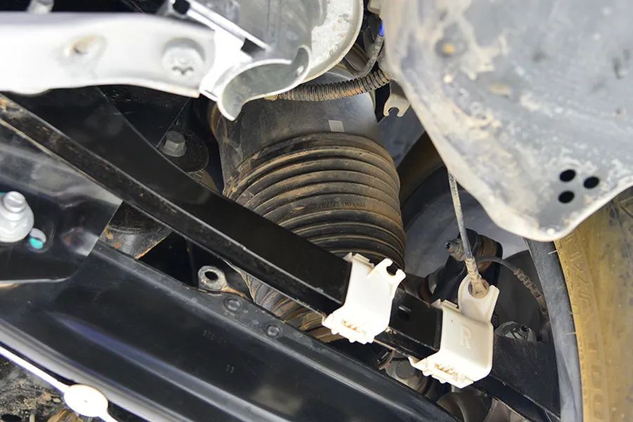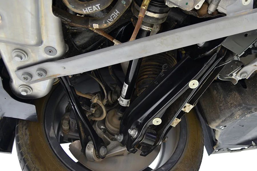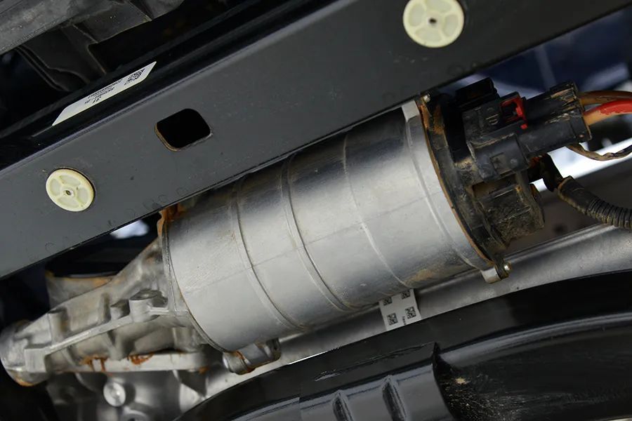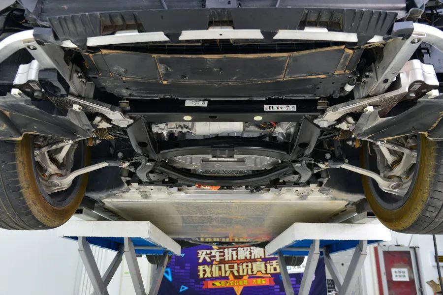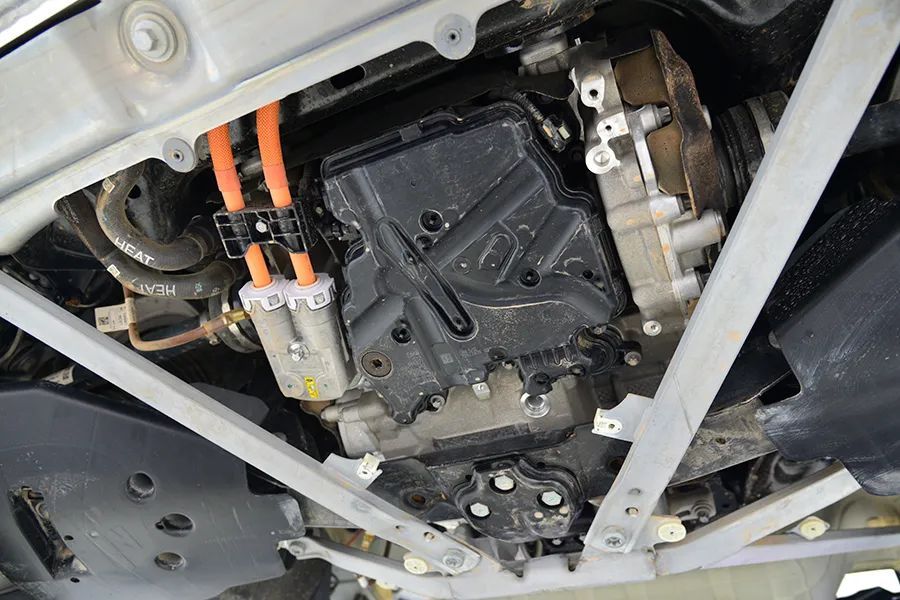 副车架为全框式结构,与汽油版的副车架完全不同,明显强度更高,还预留了安装前电机的位置。