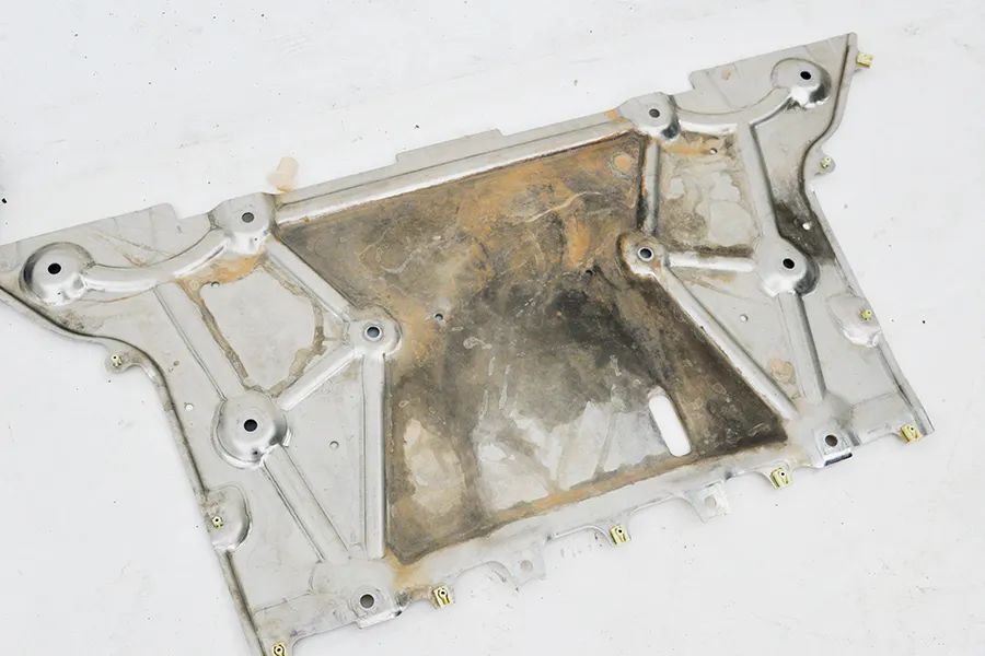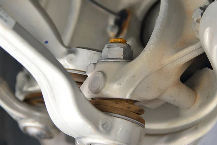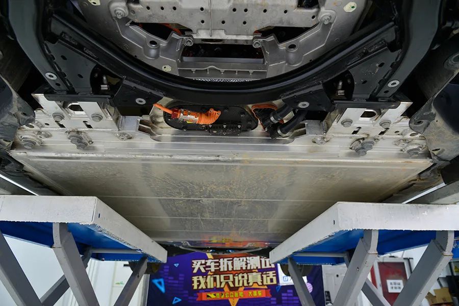 这是一辆德国车,又是一辆电动车,底盘平整度自然不错。同时,前副车架下方配有一块厚实的铝合金护板,不仅能起到扰流防尘的作用,还有一定的防护能力。