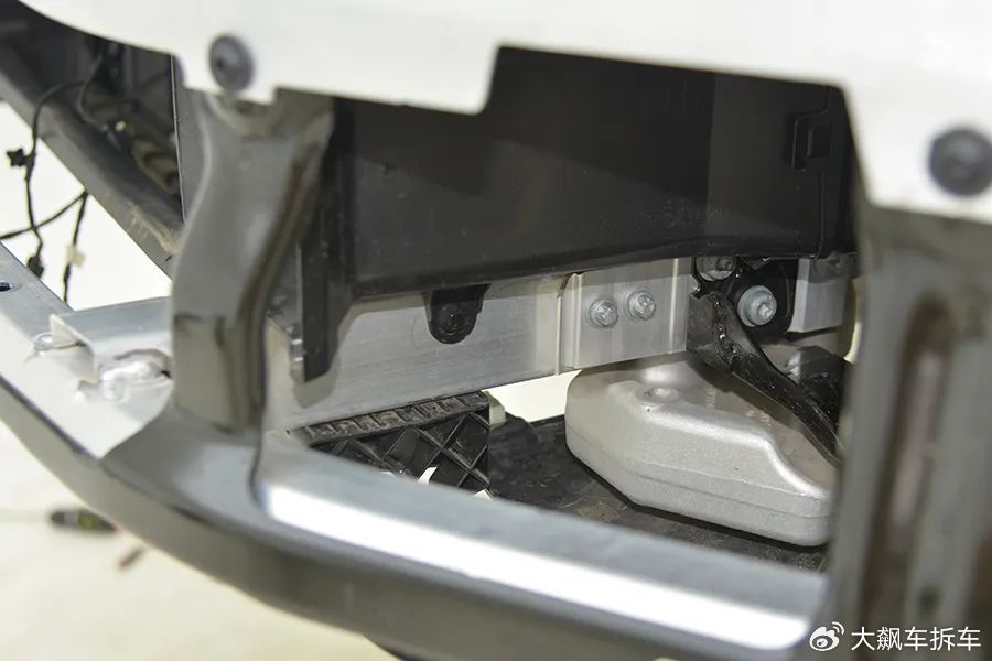 前吸能盒也是铝合金材质,通过螺栓固定,带有溃缩诱导。