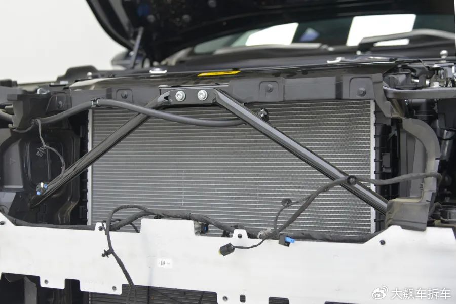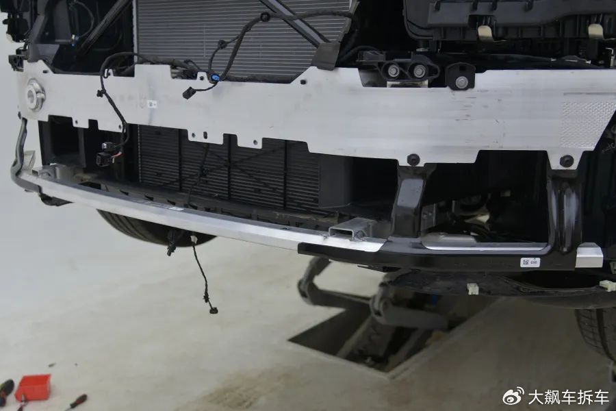 拆掉前保险杠,能看到有一根铝合金前防撞梁,厚度达到了6毫米,能覆盖车头的91.80%,相当宽。而上一代5系(配置|询价)的前防撞梁虽然也是铝合金材质,但厚度只有2.18毫米。