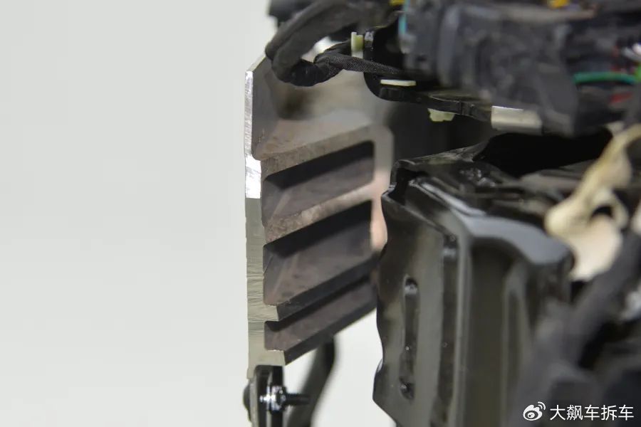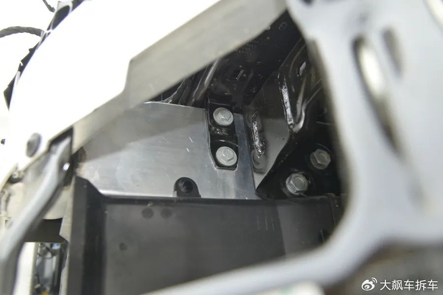 后吸能盒没有缺失,也是钢板材质,设计非常完整,带有溃缩褶皱。