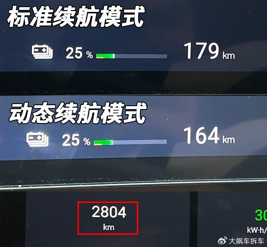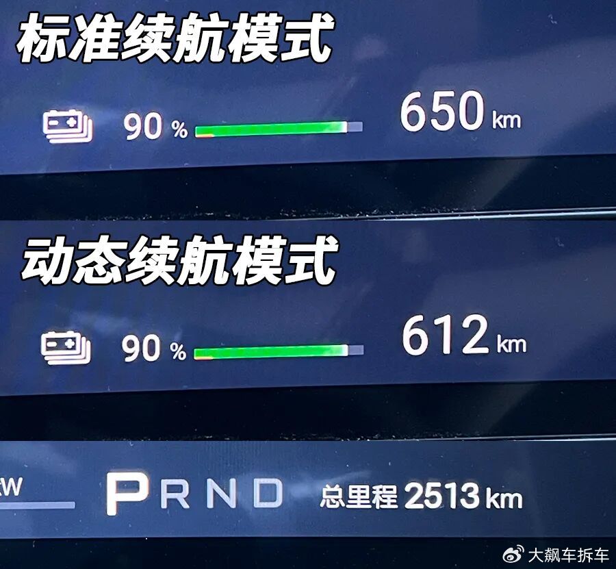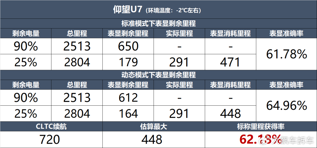这辆车搭载了一块135.5千瓦时的磷酸铁锂刀片电池,CLTC标称续航里程720公里。在北京冬季平均零下-2摄氏度左右的气温下测试,充电至90%,标准显示续航里程650公里,动态续航显示里程612公里。行驶到电量剩余25%时,标准显示可续航里程179公里,动态显示可续航里程164公里。标准模式表显消耗里程471公里,动态模式表现消耗里程448公里,实际行驶里程291公里。计算得出标准模式表显准确率为61.78%,动态模式表显准确率为64.96%,CLTC续航里程估算获得率为62.18%。