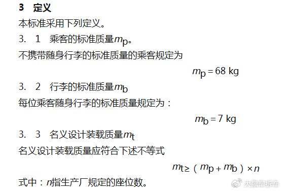 根据GB/T 5910-1998《汽车质量分布》规定,名义设计装载质量需要大于或等于乘客的标准质量加上行李的标准质量。其中,每位乘客的标准质量为 68千克,每位乘员随身行李的标准质量为7千克。加起来,一个人就是75千克。因此,一辆车名义设计装载质量需要不小于375千克。