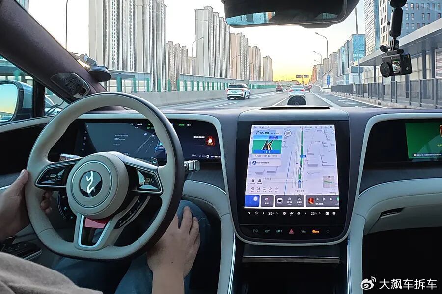 这套系统在高速和封闭道路上,表现比较稳定,领航辅助功能可以顺畅地完成车道保持、自主变道以及进出匝道等基础操作,在横向变道的节奏控制上较为平顺,没有明显的突兀感。在决策方面,追求稳健,主动变道超车的情况比较少。 在交通流密集的城市复杂路段,系统博弈逻辑“保守”,在面临无保护转向、逆行车辆或外卖单车切入时,系统的安全策略极其保守。甚至应对某些特殊路况时,会出现偏离路线、误入逆行的情况。