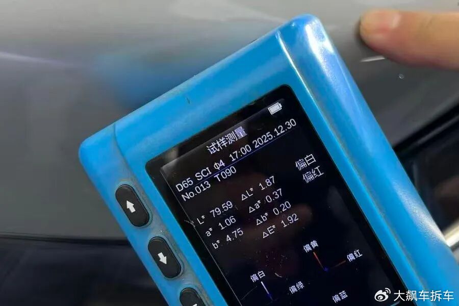 经过测试,最大色差值位于前保险杠处,色差值为1.92ΔE,比基准点偏白偏红。从数值上来看,这辆车的喷漆工艺质量控制还可以。