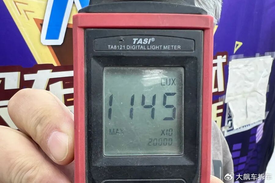 测试方法:以车灯最前端为基点,与垂直墙面相距2米距离,在发动机正常工作状态下进行测试,使用光线照度计取近光灯照明范围内的最大值。