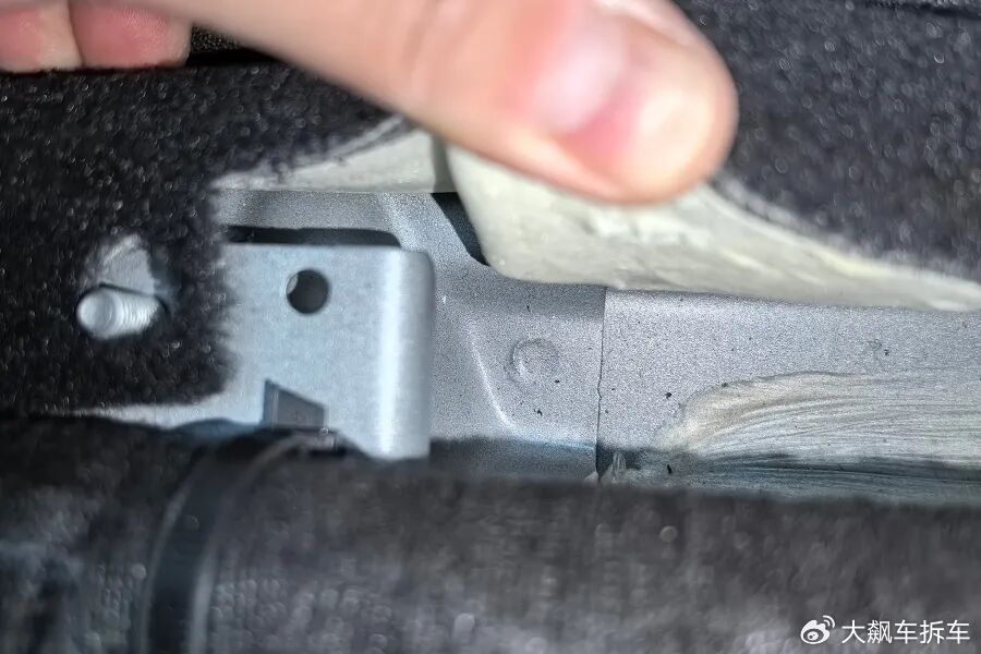 从车身门槛位置的焊点能判断,这辆车的车体框架都是钢板焊接而成,没有使用铝合金部件减重。