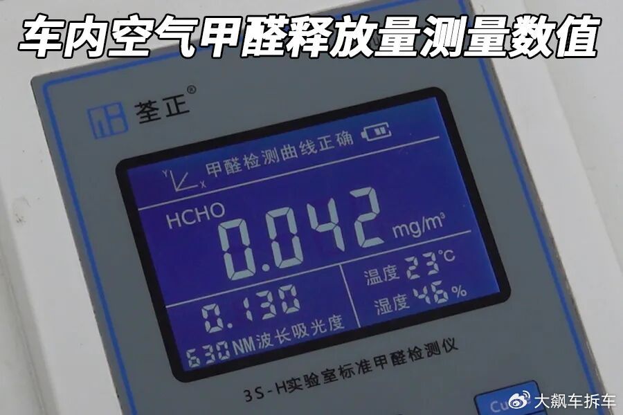 经过在23±1℃恒温环境中16小时的封闭,这辆车的车内空气甲醛释放量测量数值为0.042毫克每立方米。