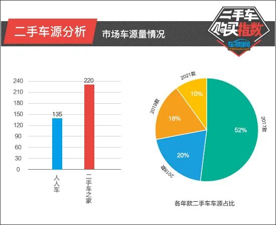 在挑选二手车时,市场车源量是否充足同样是消费者重点考虑的问题之一。如果车源充足的话,一方面消费者可选择余地更大,另一方面也增加了进一步议价的机会。而如果车源相对不足或者说非常少,那可能会对消费者是否继续选购该款车产生较大影响。车质网参考人人车、二手车之家平台数据,统计得出目前比亚迪宋MAX的全国二手车车源量为:人人车发布车源135辆、二手车之家发布车源220辆。从占比情况来看,2017款车型占据了较大的市场份额,单一年款车型占比达到了52%。而2018款-2021款也存在一定比例,且占比比较均匀。