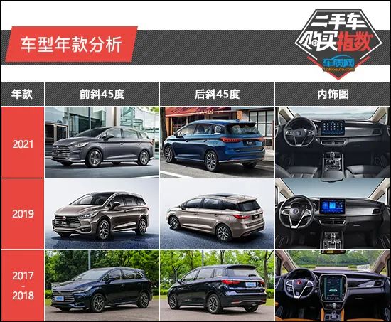 目前,国内二手车市场中,比亚迪宋MAX仅有一代车型,该车期间经历过一次较大的改款,主要针对内饰设计进行了升级,动力参数也有轻微提升。另外,该车2017-2019款部分车型为国Ⅴ排放标准,北上广深等一线城市上牌不成问题,但不能从外地迁入。综合来看,2017-2021款车型均在可选择范围内。