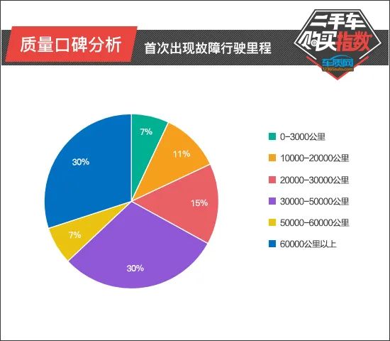 从首次出现故障的行驶里程占比来看,20,000公里以内出现故障的占比之和较低,整体还不到两成。侧面也说明了比亚迪宋MAX在新车购买后出现故障的时间较为靠后,新车阶段出现故障的概率较小,产品整体质量水平相对比较稳定。