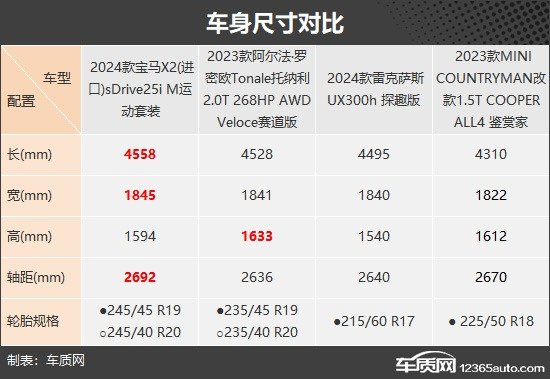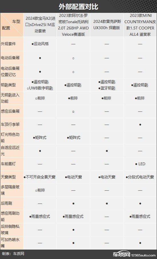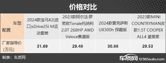 本次挑选的四款车型分别为2024款宝马X2(配置|询价)(进口)(以下称:宝马X2)、2023款阿尔法·罗密欧Tonale托纳利(配置|询价)(以下称:阿尔法·罗密欧托纳利)、2024款雷克萨斯UX(配置|询价)(以下称:雷克萨斯UX)以及2023款MINI COUNTRYMAN(以下称:MINI COUNTRYMAN),四款车型均定位紧凑型SUV。价格方面,虽然宝马X2的官方价格门槛超过30万元,但如果考虑到经销商优惠,其实际售价可以低至30万元以内(由于目前图片数量较少,因此部分车型的图片并不是相对应的具体款型)。