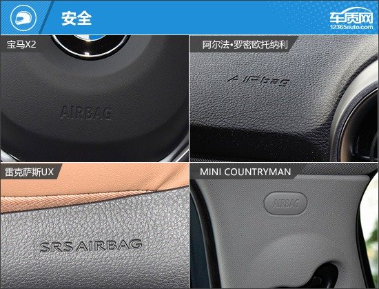 安全配置方面,阿尔法·罗密欧托纳利和雷克萨斯UX均配备了主驾膝部气囊,能够有效降低事故发生时对人体的伤害。不仅如此,雷克萨斯UX还配备了后排侧气囊,安全性更高。主动安全方面,宝马X2表现更优,独享DOW开门预警、后方碰撞预警。相比之下,MINI COUNTRYMAN主动安全配置表现拉胯,配置缺失较多,与其他三款车型拉开明显差距。