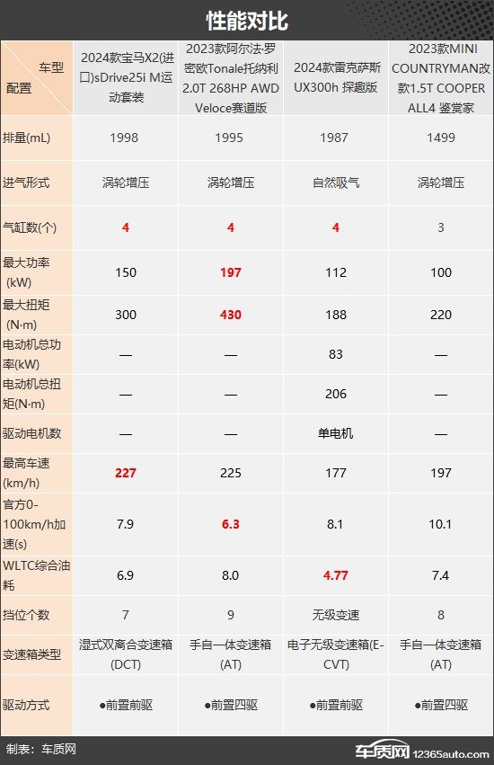 动力方面,除雷克萨斯UX采用油电混合动力外,其余车型的能源类型均为汽油。从参数来看,阿尔法·罗密欧托纳利的发动机最大功率和最大扭矩优势明显,官方0-100km/h加速是四款车型中最出色的。同时,其还配备了全时四驱系统,动态稳定性更优。相比之下,MINI COUNTRYMAN要逊色于另外三款车型,虽然其配备了适时四驱系统,但官方0-100km/h加速依然是四款车中最差的,且其1.5T发动机还采用很多国内消费者不喜欢的三缸设计。