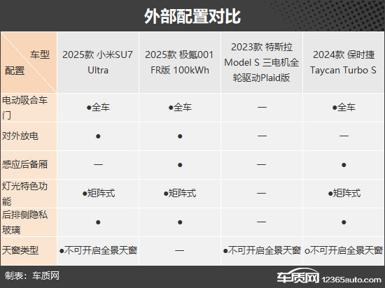 外部配置方面,小米SU7 Ultra、极氪001 FR以及保时捷Taycan均配备了全车电动吸合车门和矩阵式大灯,科技感比较出色。其中,小米SU7 Ultra和极氪001 FR还额外提供对外放电,能够满足用户在多种场景下的用电需求。相比之下,特斯拉Model S外部配置表现一般。
