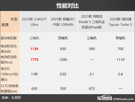 动力方面,四款车型均采用纯电动驱动形式。不过,极氪001 FR采用四电机驱动、小米SU7 Ultra和特斯拉Model S均采用三电机驱动,保时捷Taycan数量最少,为双电机。从官方公布的动力参数来看,小米SU7 Ultra电动机总功率最为出色,并且也是唯一零百加速2s以内的车型,动力表现非常夸张。
