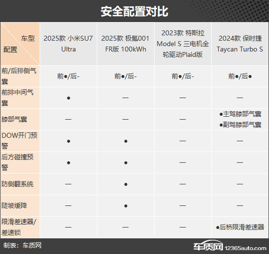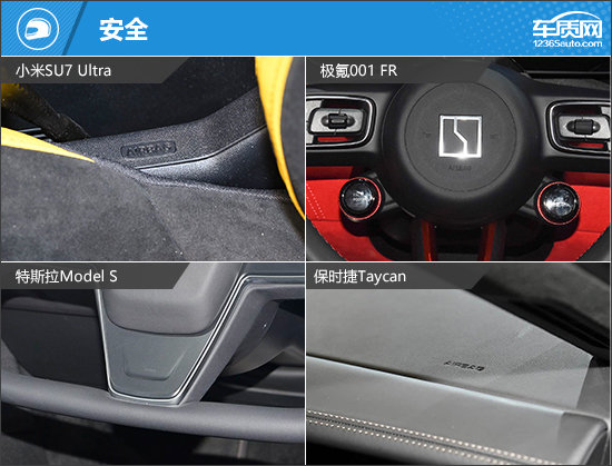 安全配置方面,小米SU7 Ultra、极氪001 FR以及保时捷Taycan侧重点有所不同。其中,小米SU7独享前排中间气囊;极氪001 FR则独享防侧翻系统和陡坡缓降;保时捷Taycan配备了后排侧气囊、主/副驾膝部气囊以及后桥限滑差速器。相比之下,特斯拉Model S在安全配置方面的表现稍显逊色。