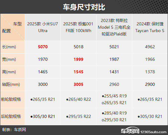 车身尺寸方面,极氪001 FR包揽了车宽、车高以及轴距三项数据冠军,小米SU7 Ultra则在车身长度上占优。当然,无论参数上差多少,四款车型实车看上去也都很显大。另外,极氪001 FR标配了尺寸夸张的22英寸轮毂,视觉冲击力十足。