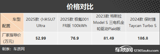 此次推荐的四款车型分别是小米SU7 Ultra、极氪001 FR(配置|询价)、特斯拉Model S以及保时捷Taycan(配置|询价)。小米SU7 Ultra无需过多介绍,其火热程度足以说明一切;极氪001 FR除了拥有强大性能外,还保留了极氪001标志性的猎装车造型,兼顾性能与实用性;特斯拉Model S无疑是科技与性能完美结合的代表;保时捷Taycan Turbo S则将品牌百年赛道基因与电动化完美融合。当然,四款车型的售价跨度较大,但也正因如此,为不同预算的消费者提供了丰富的选择空间,满足多样化的需求。