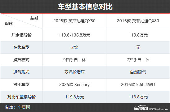 2025款英菲尼迪QX80共推出了2款车型,相比2016款英菲尼迪QX80增加了1款。售价方面,新款车型虽然售价要高于老款车型,但全系标配3.5T双涡轮增压发动机,并且配置也得到显著提升。本次对比分别选择了两款售价相近的车型,以便能够更加直观地看出新老款车型在配置层面的具体差异。(由于目前图片数量较少,因此新款车型的图片并不是相对应的具体款型)