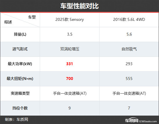 动力方面,新款车型摒弃了老款车型上的5.6L自然吸气发动机,取而代之的是3.5T双涡轮增压发动机。虽然看似排量变小了,但无论是最大功率还是最大扭矩,均得到较大的提升。并且变速箱升级为9挡手自一体,燃油经济性或将好于老款车型。