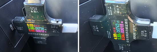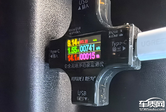 同时,我们对USB接口的电压、电流和功率进行了测试。前排USB Type-C接口充电功率5.46W,电压5.03V、电流1.08A;前排USB Type-A接口充电功率6.54W,电压4.88V、电流1.33A;后排USB Type-C接口充电功率14.1W,电压9.14V、电流1.55A。
