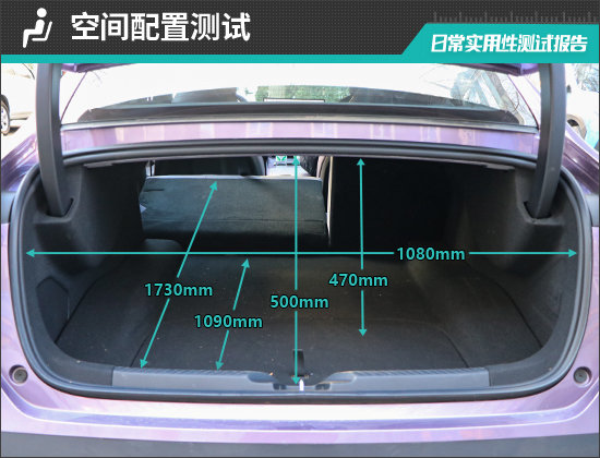 对于评测车后备厢的基础数值,我们也进行了实测,开口长度为500mm;开口宽度为1080mm;后备厢进深为1090-1730mm;后备厢地台与顶部的垂直高度为470mm。