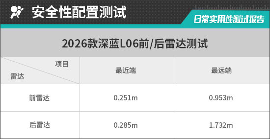 前雷达在0.953m处可感应到物体,雷达功率表现尚可。从实测数据来看,前雷达最近提示距离为0.251m,达到了同级别车型平均水平。