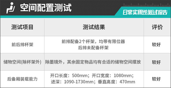 对于车内使用空间的测试,只针对前排触手可及的空间,不包括手套箱、中央扶手箱等需开启的空间。测试方法是将以下固定物品全部放置在前排的各个储物空间内,通过固定物品的放置情况来判断车辆储物空间的表现。测试选定的固定物品为:2瓶常规大小的矿泉水、1部大屏手机、1支口红、1个挎包、1副墨镜、1把折叠雨伞以及1包常规尺寸的抽纸。