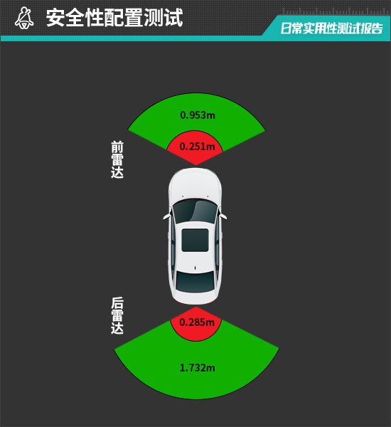 在测试过程中,倒车雷达在1.732m处可感应到后方物体,雷达功率表现相当出色。从实测数据来看,后雷达最近提示距离为0.285m,未达到同级别车型平均水平。