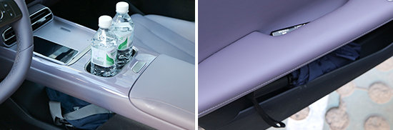经过实测,评测车的储物空间数量较多,除墨镜外,其余固定物品均能找到合适的位置放置,整体表现不错。不过,车内杯架数量偏少,仅前排配备了2个带限位器的杯架。