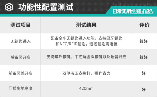 评测车的后备厢支持车外按键、中控屏虚拟按键以及语音开启,并支持电动后备厢位置记忆功能,使用便利性表现不错。