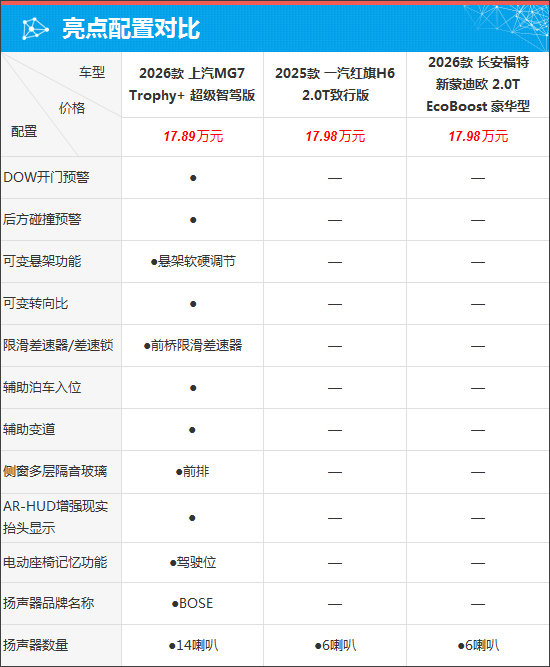 具体到车辆配置层面,通过对比来看,MG7表现更胜一筹,不仅安全性、智能化和舒适性等方面有着优势,更独享悬架软硬调节、可变转向比、前桥限滑差速器等驾驶相关功能,对于提升驾驶感受大有益处。相比之下,另外两款车型的配置缺失比较明显。