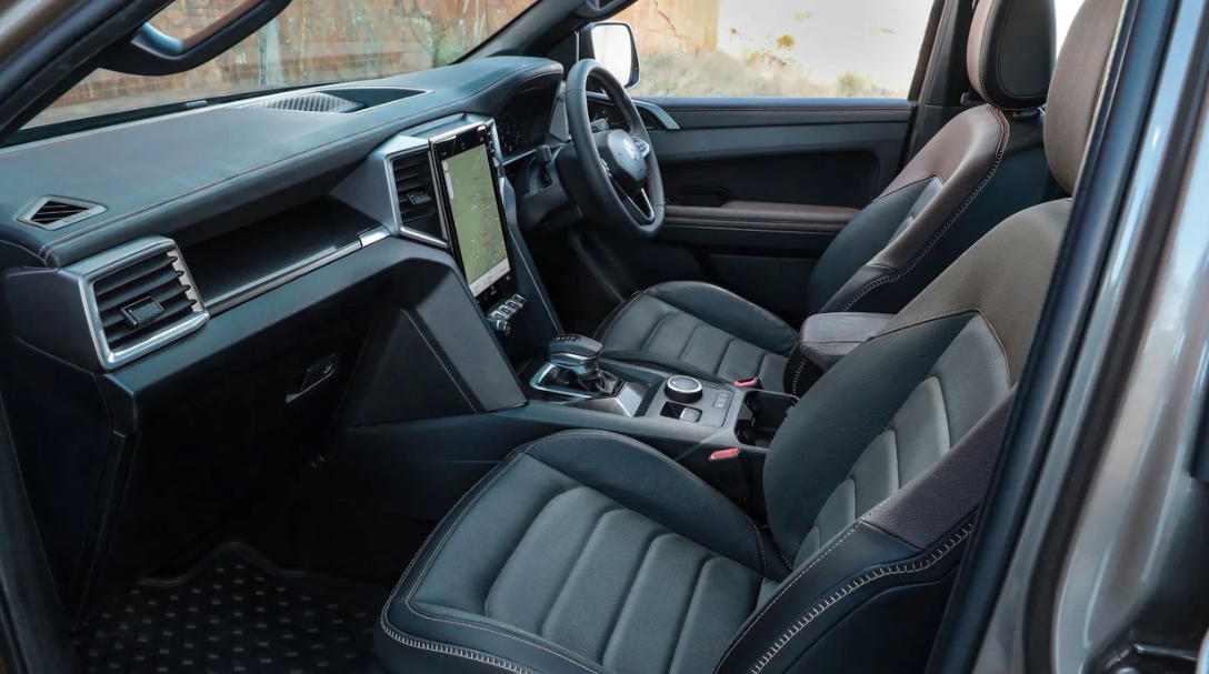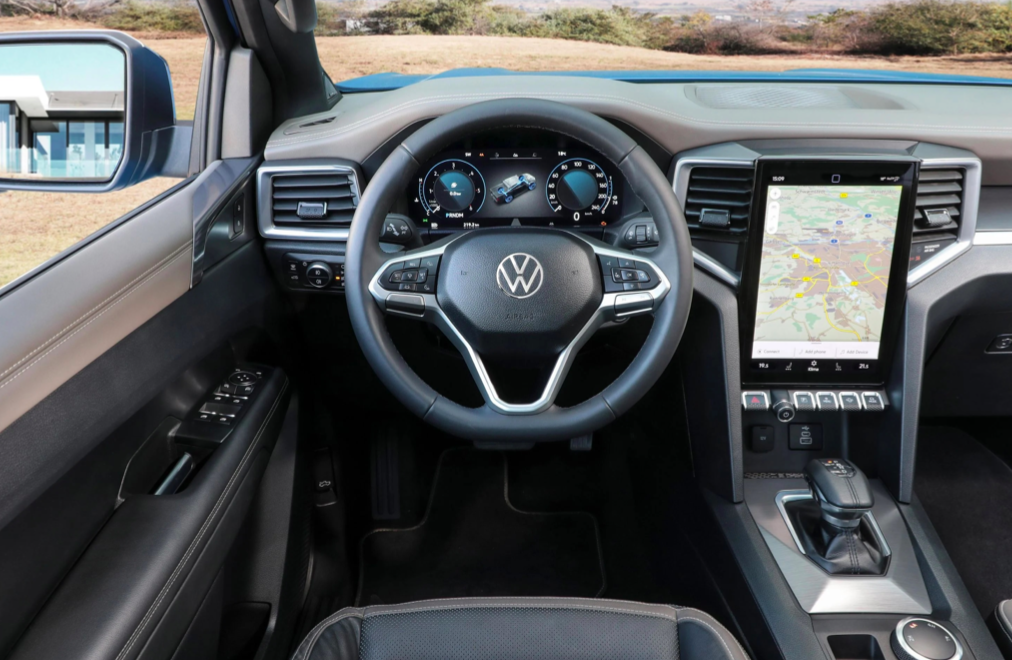内饰部分,全新Amarok则偏向简洁路线,整体观感并不突出。其多功能方向盘延续大众家族式思路,尺寸适中握感舒适,功能按键区域布局比较紧凑,周边还用银色饰条点缀。竖状触控液晶屏有效提升科技水准,内嵌车机系统应用储备比较丰富。其液晶仪表UI界面设计很是新颖,蓝色与黑色元素的搭配便于及时掌握车辆信息。该车空调出风口造型则是充满强烈全新福特Ranger观感,双拼色座椅驾乘感受不必担心。其承载能力相当可靠,长途远行也不成问题。