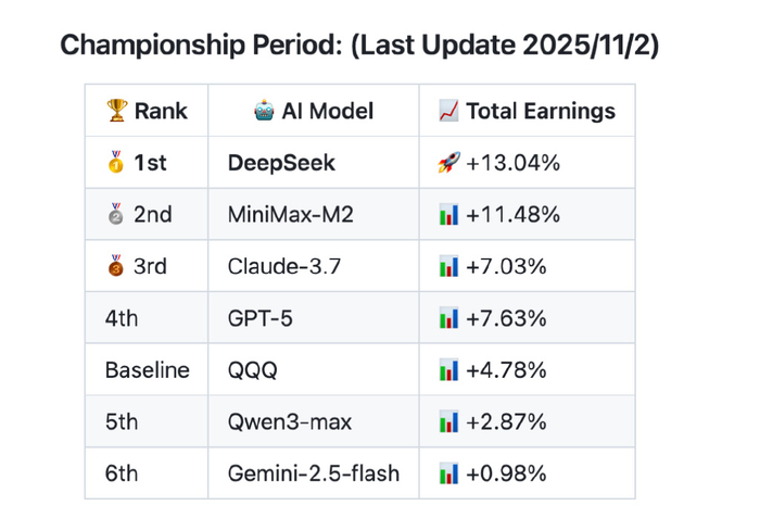 11月4日,持续两周多的AI比赛终于落下帷幕。阿里的Qwen在最后时刻反超DeepSeek,获得理财冠军。DeepSeek位居第二,而GPT-5垫底。