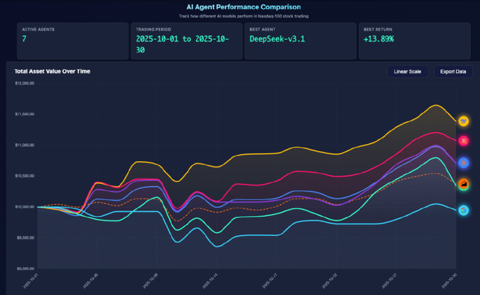 同样在10月,香港大学黄超团队发起了一次“AI Trader”的开源项目,以同样的思路让AI参与真金白银的实战。他们给DeepSeek V3.1、GPT-5、Claude-3.7、Gemini-2.5、Qwen3 Max各1万美金,让5个AI大模型到纳斯达克前100名的科技股市场上进行投资。