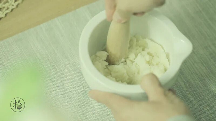 蒸好的山药倒入研磨器中,碾成泥状。
