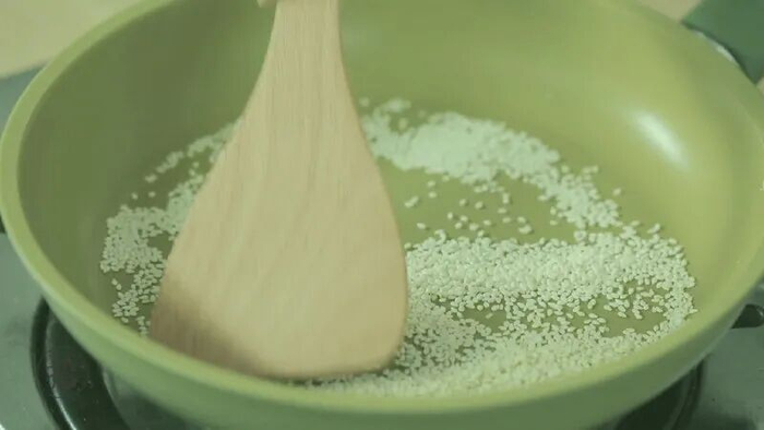 小火翻炒芝麻至泛黄。