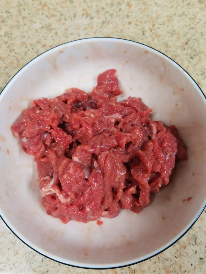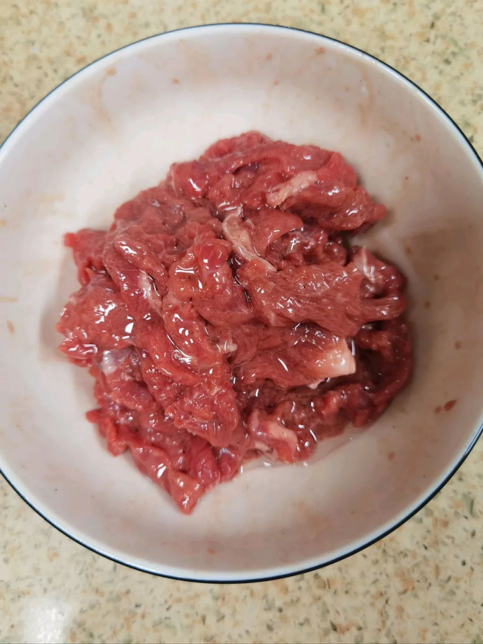 牛里脊找到纹理,横着切成薄片。