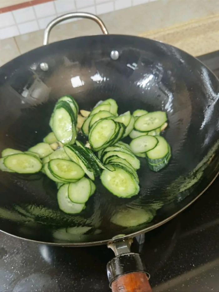 放入黄瓜片翻炒。