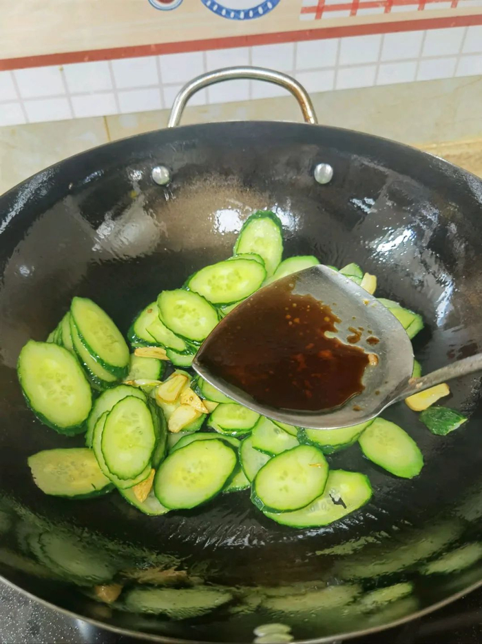 加一勺生抽把黄瓜炒软。