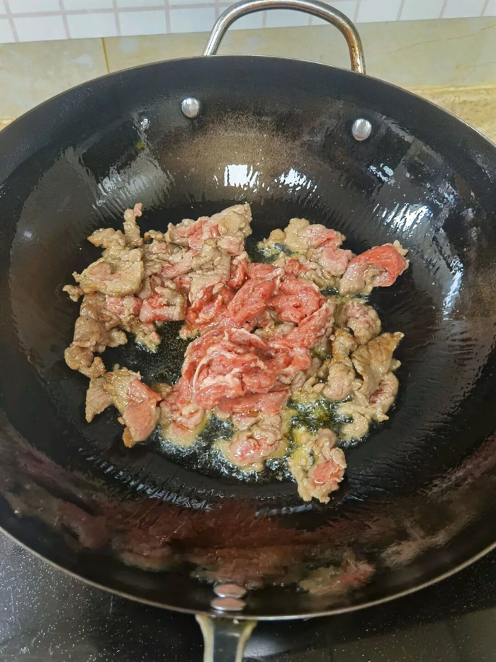 牛肉放入后不用炒太久,翻炒几下就行了。