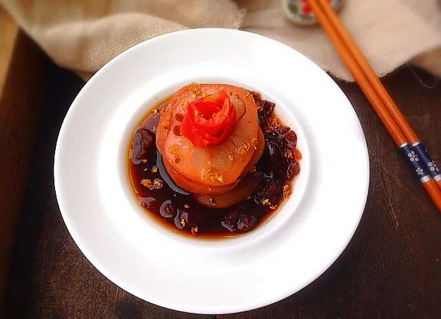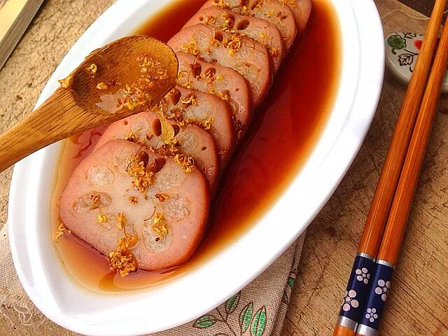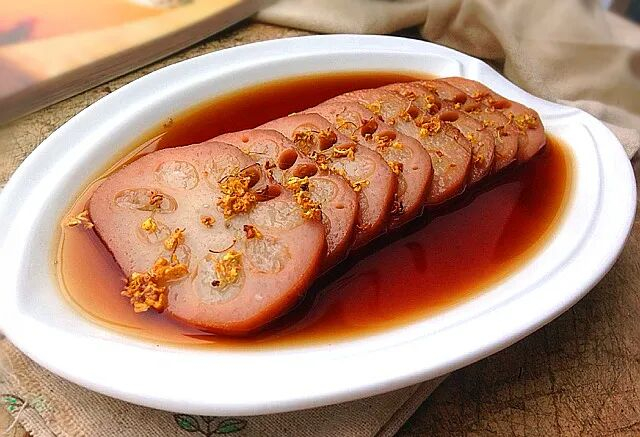 淋上煮藕的汁儿,最后淋上桂花蜜即可。