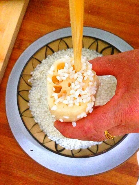 借助筷子,用手做漏斗,把米灌入藕孔,
