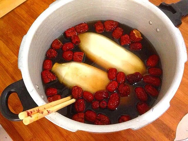 高压锅里放水淹没莲藕,放入红枣,红糖,