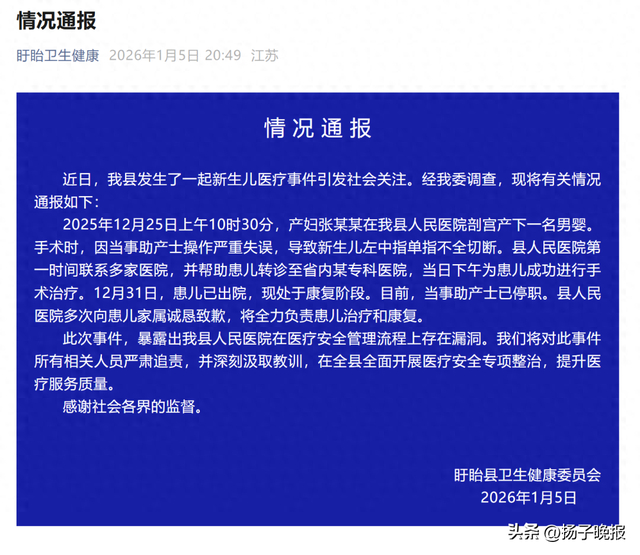 2025年12月25日上午10时30分,产妇张某某在我县人民医院剖宫产下一名男婴。手术时,因当事助产士操作严重失误,导致新生儿左中指单指不全切断。县人民医院第一时间联系多家医院,并帮助患儿转诊至省内某专科医院,当日下午为患儿成功进行手术治疗。12月31日,患儿已出院,现处于康复阶段。目前,当事助产士已停职。县人民医院多次向患儿家属诚恳致歉,将全力负责患儿治疗和康复。