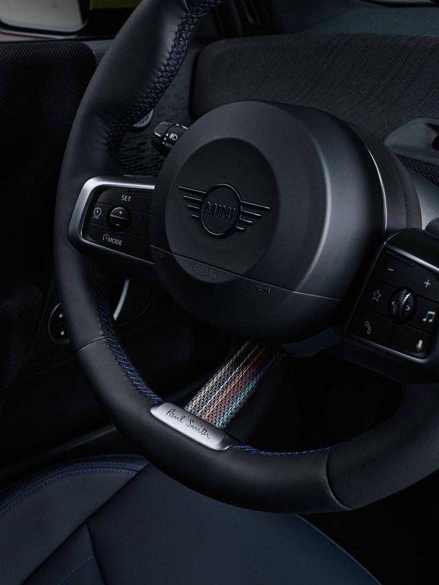 经典彩色条纹是Paul Smith的标志性设计元素。在电动MINI COOPER PAUL SMITH设计师款上,Paul Smith如同设计高定服装一般,使用了多种装饰细节和工艺呈现经典条纹。比如驾驶员侧车顶上亮眼但克制的彩色条纹装饰、方向盘上低头可见的10色编织彩条绑带、仪表台上利用环保材料立体编织的暗调条纹织物……设计师对材质、纹理、图案和色彩施展魔法,在方寸之间展现个性与美学,让这款车成为一件真正的设计师作品。