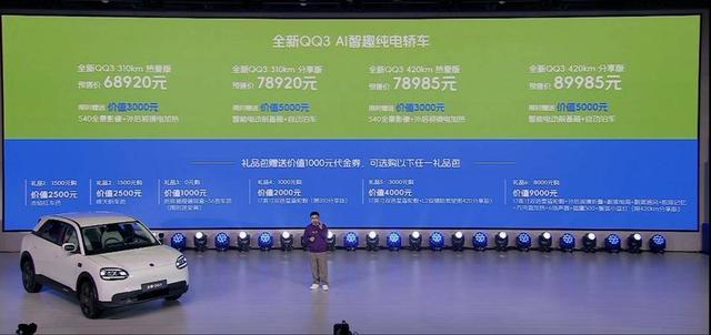 3月10日,奇瑞全新QQ3(配置|询价)正式开启预售,新车共推出310km、420km两种续航版本共四款车型,预售价68920元至89985元。秉持“高配不高价”的定价初心,全新QQ3将后置后驱、独立悬架、欧式植绒玻璃导槽等数十项越级配置纳入全系标配,真正实现“全系高配不将就”,精准契合年轻人“理性消费、追求极致性价比”的核心诉求。发布会同步推出多重购车福利:下定1000元可抵2000元,限时赠送全景影像、外后视镜加热等实用配置,进一步降低年轻体的购车门槛。这份诚意打破了常规“高品质必高价格”的固有认知,尽显国民小车的责任与担当。