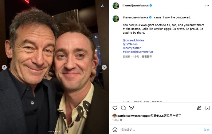 #卢爹来看德拉科马尔福演出# “卢修斯·马尔福”詹森·艾萨克来看“德拉科·马尔福”汤姆·费尔顿演出了!还在文案中用了“son”一词