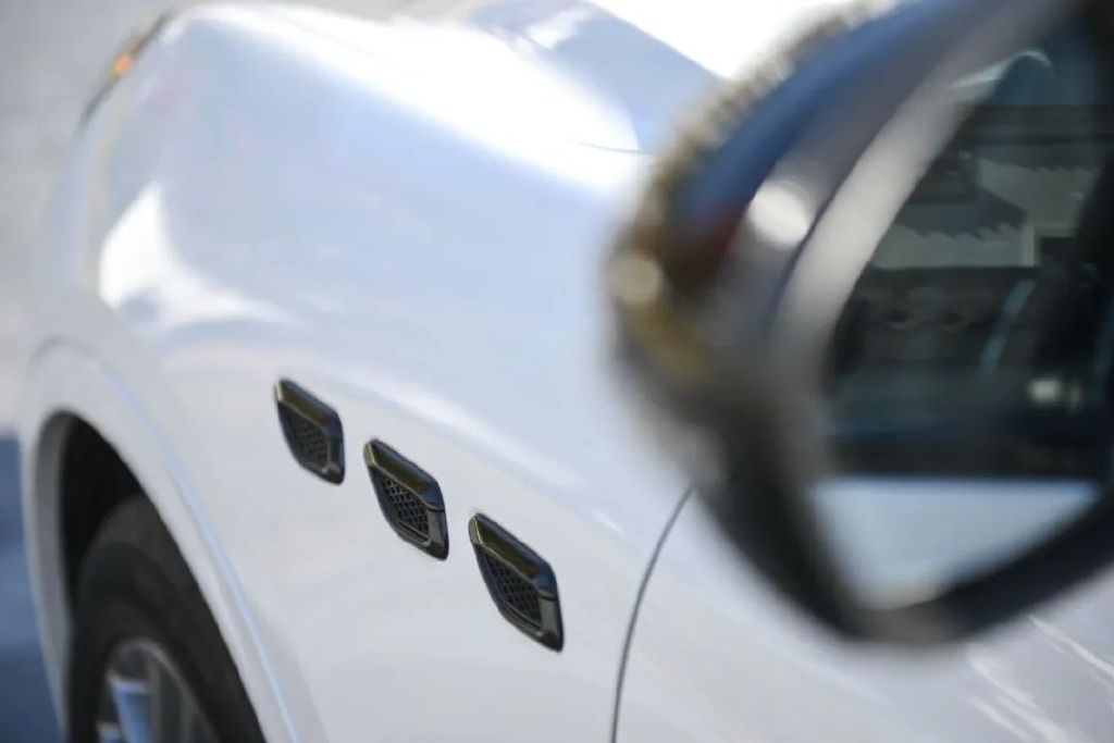 相对普通版格雷嘉,飞白特别版的不同主要体现在车身配色方面。首先是车身采用极具质感的白色涂装,其次很多细节部位,包括品牌标志性的侧面鲨鱼腮,C柱的三叉戟LOGO、反光镜、门把手,还有车窗饰条等都采用了熏黑处理。单独观察,似乎并无多大特色。但是一旦将这台车放置在黄山地区特有的酷似中国水墨画的环境之中,你会发现,它非但没有让人觉得有一丝违和的感觉,甚至还与周围环境相当融洽。